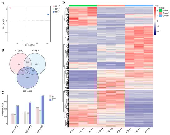 To further investigate the molecular responses of C. napifera (Franch.) Babc. to altitude, RNA sequencing was performed on root tissues, and the information on quality control is shown in Table S3. The principal component analysis (PCA) revealed clear clustering of the three groups, indicating that their transcriptional profiles were distinctly influenced by altitude (Figure 2A). A total of 3679, 8615, and 11,333 differentially expressed genes (DEGs) were identified in the H1 vs. H2, H2 vs. H3, and H1 vs. H3 comparisons, respectively (Figure 2B,C). Notably, 1632 DEGs were unique to the H1 vs. H2 comparison, while 3331 were unique to H2 vs. H3, and 1986 were unique to H1 vs. H3. Furthermore, 497 DEGs were common across all comparisons (Figure 2B).
