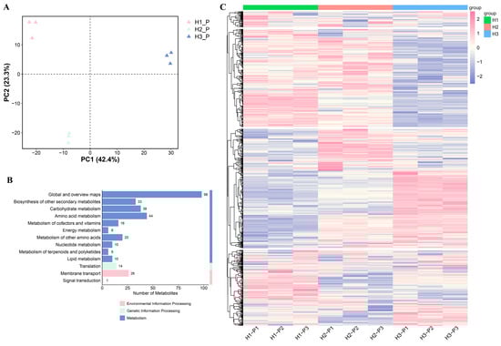 Metabolomic analyses were conducted to characterize the metabolic profiles of C. napifera (Franch.) Babc. roots. PCA revealed that a distinct clustering of replicates was observed within each group, with the model accounting for 65.7% of the total variance (Figure 3A). In total, 462 differentially expressed metabolites (DEMs) were identified in the H1 vs. H2, H2 vs. H3, and H1 vs. H3 comparisons (Figure S2A). Among these compounds, terpenoids, phenolic acids, and amino acids and their derivatives, as well as lipids and alkaloids, exhibited the highest contents, accounting for 62.98% of the total content of the differential metabolites (Figure S2B). Based on the trends observed in metabolomic accumulation, three distinct clusters were identified. There are notable variations in the accumulation of metabolites in the roots of C. napifera (Franch.) Babc. across different regions (Figure S2C).