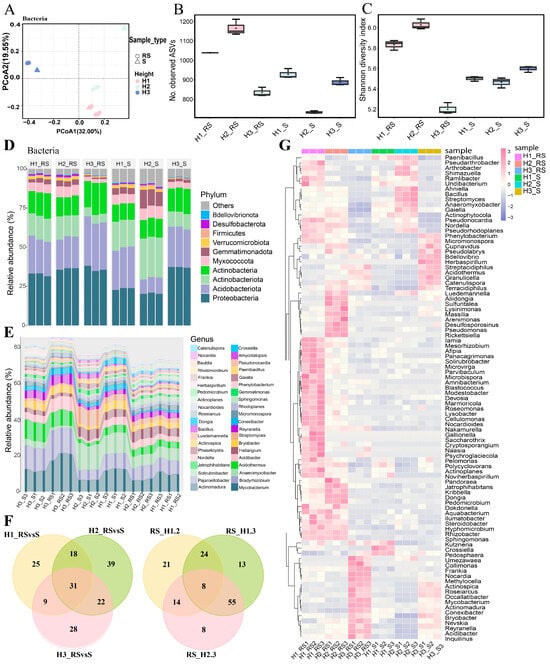 Analysis of the bacteria community from roots of C. napifera (Franch.) Babc. at different altitudes. (A) Principal component analysis (PCA) of the detected root (R) and rhizosphere soil (RS) samples via 16s rRNA sequencing. (B) Display of the observed amplicon sequence variants (ASVs) in R and RS. (C) The Shannon Diversity Index of R and RS. (D) Relative abundance of R and RS at the phylum level. (E) Relative abundance of R and RS at the genus level. (F) Venn diagram depicting the relative abundance of R and RS at the genus level. (G) Heatmap of the abundance of R and RS at the genus level.