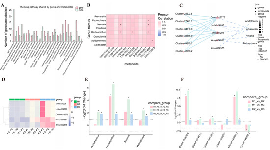 The potential correction on gene expression, metabolites, and microorganisms at different altitudes. (A) The KEGG both enriched in RNA and metabolites detection. (B) The Pearson’s correlation between detected genera and metabolites. The symbol “*” represented the metabolites showed correlation with microbe. (C) Correlation analysis of the transcriptome, metabolome, and 16S sequencing. (D) Analysis of the accumulation pattern of the above metabolites. (E) Comparative analysis of the gene expression levels under different altitudes comparison. The symbol “*” represented the significant differentiation with p value < 0.05. (F) Comparative analysis of the microbial community’s enrichment under comparison of different altitudes. The symbol “*” represented the significant differentiation with p value < 0.05.
