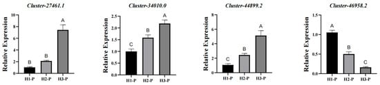 To validate the reliability of the transcriptome data, four genes mentioned in Figure 5F were selected to analyze their expression levels via qRT-PCR. The qRT-PCR analysis revealed a significant correlation between the relative expression of these genes as the altitude rises and the transcriptome information, thereby indicating the trustworthiness of the data (Figure 6).