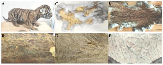 To evaluate the influence of tanning on sequencing quality, hair (including both guard and underside hair) was sampled from 13 skins that were sorted into three tanning degrees. Level-1 were untanned and naturally dried skins including two Amur tigers (H19, H20), a leopard cat (H21), a wolf (H22), a Siberian roe deer (H23), a red deer (H24), and an Eurasian moose (H25) (Figure 1A,B); Level-2 were moderately tanned including a yellow-throated marten (H26), a mountain hare (H27), a red fox (H28), and a wolf (H29) (Figure 1C,D); and Level-3 were fully tanned including two leopard cats (H30, H31) (Figure 1E,F). Additionally, we used the DNA from skin preserved at −20 °C (S1~S13) as a control for each species.