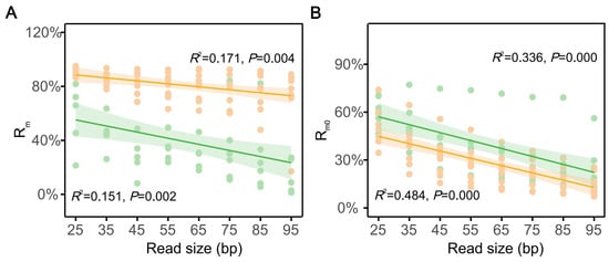 The relationship between Rm (A) and Rm0 (B) and read size in two types of mammalian guard hairs. A serial size ranges were subsampled with a step length of 10-bp from the total cleaned reads of each sample, and each range was represented by the middle value shown as a dot. The yellow section represents lightly medullated hairs, whereas the green section represents highly medullated hairs. The shading ranges show the 95% confidence interval.