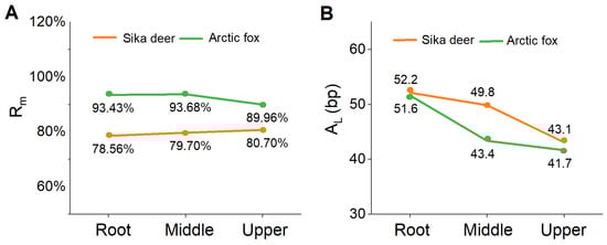 We evaluated variations in the sequencing quality of the root, middle, and upper sections of guard hairs using Arctic fox and sika deer as representatives of lightly and highly medullated hairs. The results demonstrated Rm was stable across the three sections (Figure 3A), whereas AL decreased slightly from the root to the upper part, with a difference of approximately 10 bp (Figure 3B). These findings suggest that the genomic DNA content is even along the hair shaft, whereas the degree of fragmentation increases towards the tip.