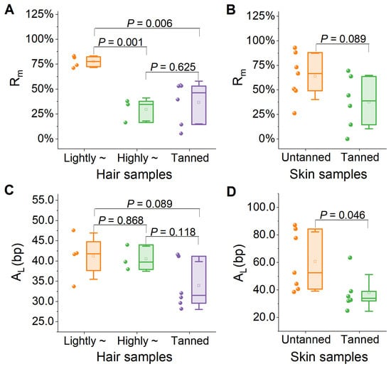 Effects of tanning on the genomic sequencing quality of hair shafts and skin. (A) Mapping rate of reads (Rm) for hair samples; (B) mapping rate of reads (Rm) for skin samples; (C) average read size (AL) for hair samples; (D) average read size (AL) for skin samples. Lightly ~ represents untanned, low-medullated hair samples, whereas highly ~ denotes untanned, high-medullated hair samples.