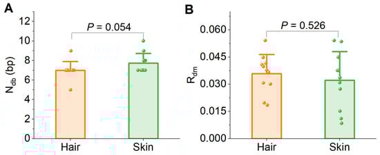 Next, we evaluated the degree of DNA damage in long-stored samples by comparing hair shaft and skin samples stored for 45–60 years. We show that the number of significantly damaged bases (Ndb) at the ends averaged 7.0 ± 0.8 bp in the hair DNA. This number was similar to the 7.3 ± 1.0 bp in skin DNA, with no statistically significant (paired Wilcoxon test: p = 0.054). The CV of Ndb were similar for hair (0.128) and skin DNA (0.130) (Figure 5A). The maximum rate of damage (Rdm) averaged 0.036 ± 0.011 in hair DNA and 0.004 ± 0.019 in skin DNA, the difference was not significant (paired t-test: |t| = 0.657, p = 0.526). However, the CV of Rdm in hair DNA (0.294) was much lower than that in skin DNA (0.494). The progress of DNA damage during preservation was similar between hair shafts and skin, but the damage rate was more stable in the hair shaft (Figure 5B). These results suggest that hair is slightly superior to skin in terms of the preservation of DNA.