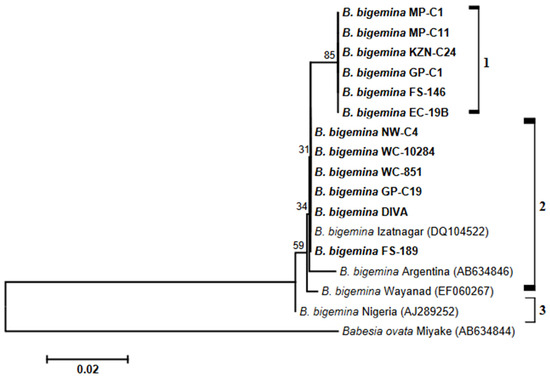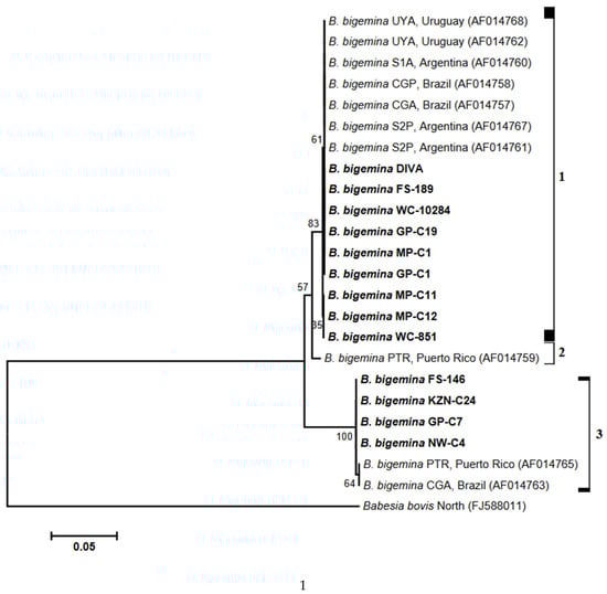 Therefore, given the huge impact of bovine babesiosis in the South African livestock industry and on the country’s economic security, the major impetus towards undertaking this study was to extend our current knowledge regarding the level and degree of sequence conservation among the field B. bigemina isolates of South African origin. In particular, the aim was to characterize the genes encoding rhoptry-associated protein 1 (BgRAP-1), apical membrane antigen 1 (BgAMA-1) and β-tubulin (BgβTUB) in B. bigemina isolates from field bovine samples. In addition, we also presented in silico bioinformatic analyses of sequences generated in this study against those from other countries published in GenBank.