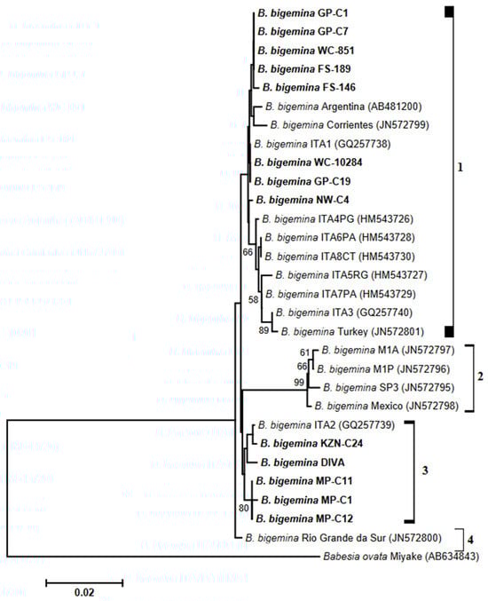 Phylogenetic analysis of BgAMA-1 genes showed that micro-heterogeneities among B. bigemina isolates caused the formation of four clusters. Although the discriminatory power within cluster 1 was low, it was noteworthy that the sequences of isolates derived from samples collected at Gauteng, Western Cape, Free State and Northwest regions were phylogenetically related to those of B. bigemina strains from countries other than South Africa. Further, the BgAMA-1 sequences of B. bigemina isolates from KwaZulu-Natal and Mpumalanga samples grouped with that of an Italian strain, sharing a sequence identity of 99.2–99.9%.
