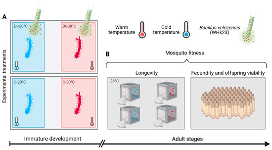 An emerging and promising microbial agent, Bacillus velezensis (Bv), has shown potential in mosquito control due to its ability to produce bioactive compounds with insecticidal properties [6,7,8,9]. Despite its promising characteristics, little is known about how environmental factors affect the efficacy of Bv against mosquito populations. Mosquito life history traits, including larval development, adult emergence, longevity, and reproductive fitness, are critical determinants of mosquito population dynamics and disease transmission risk. Because these traits are highly temperature-dependent, understanding their interaction with Bv exposure across different temperatures is essential to optimize its use under variable ecological conditions [10].