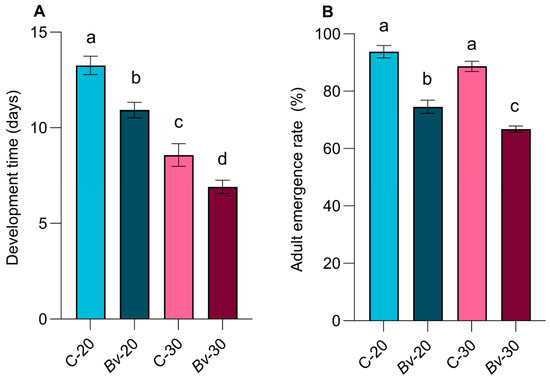 Treatment effects on immature development time (A) and adult emergence rate (B). Bars represent means ± standard error of the means. Different letters indicate statistically significant differences between treatment groups (p < 0.05).