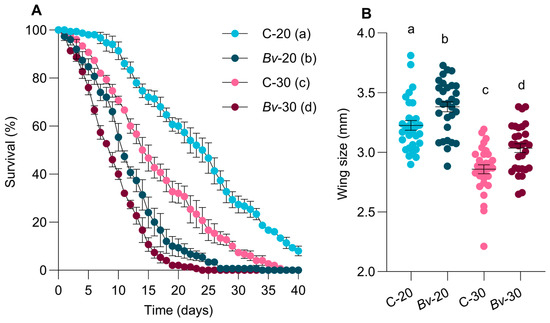 Survival curves of female mosquitoes following the exposure at immature stages. Data shown represent the means ± standard error of the means (A). Female wing length (B). Horizontal lines indicate means ± standard error of the means. In panel (B), each dot represents data from an individual mosquito. Different letters next to treatment names indicate statistically significant differences between treatment groups (p < 0.05).
