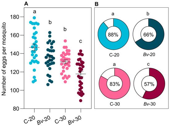 Female mosquitoes exposed to Bv were larger in body size than those in the control groups, regardless of temperature (Figure 3B). However, Bv-exposed females had lower fecundity than their control counterparts (Figure 4A).