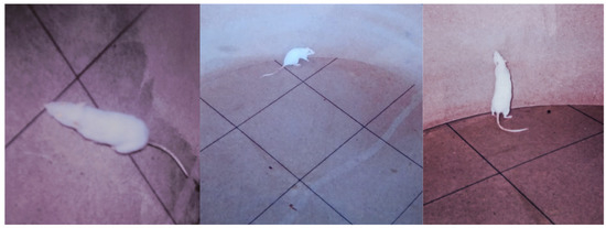 To assess changes in behavioral responses, the Open Field Test was conducted on Day 30 of the experiment. The test was performed in a circular arena with a diameter of 150 cm, divided into 16 sectors and enclosed by opaque walls 50 cm high (Figure 1). Each rat was carefully placed in the center of the arena, held by the tail, and observed for 2 min. During this period, the number of crossed sectors (horizontal activity), frequency of vertical movements, and instances of grooming, defecation, and urination were recorded. After the observation period, the rat was removed, and the arena was thoroughly cleaned to eliminate olfactory traces that could influence subsequent animals [34].