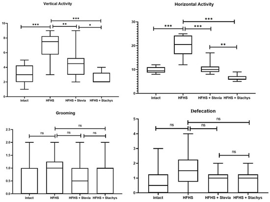 Comparison of behavioral parameters—vertical activity, horizontal activity, grooming, and defecation—across four groups: rats on a standard diet (Intact), on a high-fat, high-sucrose (HFHS) diet, and on HFHS supplemented with either Stevia rebaudiana or Stachys sieboldii (for group comparisons of vertical and horizontal activity, one-way ANOVA with Tukey’s post hoc test was used; for group comparisons of grooming and defecation, the Kruskal–Wallis test with Dunn’s post hoc test was applied). Symbols: * p < 0.05, ** p < 0.01, *** p < 0.001, ns: not significant.