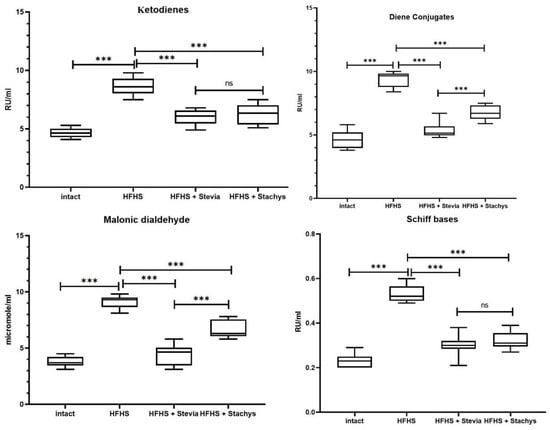 Quantitative assessment of lipid peroxidation markers (malondialdehyde, conjugated dienes, ketodienes, and Schiff bases) in brain homogenates from rats receiving a standard diet, a HFHS diet, and HFHS diets supplemented with Stevia rebaudiana or Stachys sieboldii (for group comparisons, one-way ANOVA with Tukey’s post hoc test was used). Symbols: *** p < 0.001, ns: not significant.