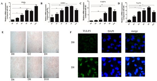To investigate the effect of TULP3 on lipid differentiation of 3T3-L1 cells, cells were collected at 0, 2, 4, 6, 8 and 10 d after differentiation. We examined the expression levels of TULP3 and lipid formation differentiation marker genes at different stages of 3T3-L1 cell differentiation, and found that compared with D0, the expression of PPARγ and C/EBPα started to increase significantly at D4 and was most significant at day D6. And the expression trend of TULP3 was similar to that of lipidogenic differentiation marker genes (Figure 1A–D). Oil Red O staining of the cells during the process of cell differentiation revealed that the number of lipid droplets became dense as the cell differentiation progressed (Figure 1E). Subcellular localization of TULP3 using laser confocal showed that TULP3 protein was expressed outside the nucleus at D0, whereas the expression of TULP3 protein in the nucleus was significantly higher at D8 (p < 0.05) (Figure 1F). These findings demonstrate that TULP3 protein undergoes translocation from the cytoplasm into the nucleus during cell differentiation. Taken together, this induction method was shown to be feasible and the precursor adipocyte lipidogenic differentiation was associated with the expression of the TULP3 gene, which was transferred from the cytoplasm into the nucleus after being induced to differentiate.