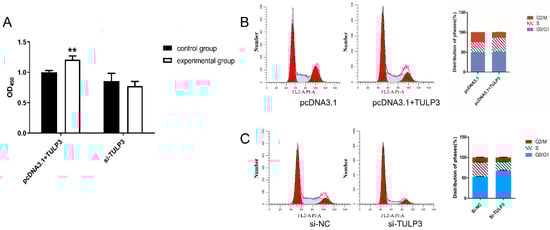 The interference fragments and overexpression vectors were transfected into cells, and when the cell density reached about 80%, the cell proliferation activity was detected using the CCK-8 kit. In addition, the cells were stained with PI and assayed by flow cytometry. It was found that when overexpressing TULP3, the cells produced more metazan and were more active, with higher absorbance values at 450 nm. While interfering with TULP3 had a tendency to reduce the proliferative activity of the cells, the difference was not significant (Figure 2A). The results of flow cytometry showed that the proportion of S-phase cells in cells overexpressing TULP3 (35.24% ± 0.68%) was significantly higher (p < 0.05) than that of control cells (24.79% ± 0.74%) (p < 0.05), while the proportion of G2/M-phase cells (14.30% ± 0.79%) was significantly lower than that of control (25.43% ± 0.12%) (p < 0.05) (Figure 2B). Si-TULP3 group had a significantly higher proportion of G0/G1-phase cells (67.71% ± 0.98%) than that of the si-NC group (52.55% ± 0.64%) (p < 0.05). The proportion of S-phase cells in the si-TULP3 group (21.21% ± 0.14%) was significantly lower than that of the si-NC group (34.83% ± 1.38%) (p < 0.05) (Figure 2C). The above results suggest that overexpression of TULP3, promotes DNA synthesis in S-phase cells, which promotes the proliferation level of the cells. And interference with TULP3 may inhibit DNA synthesis in S-phase cells, which leads to the blockage of cells in G0/G1 phase.