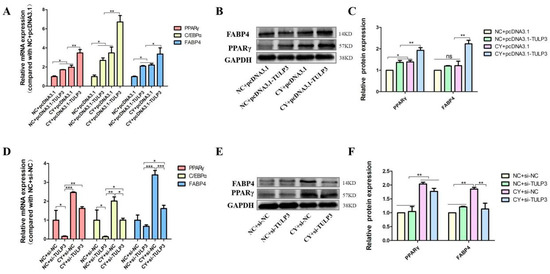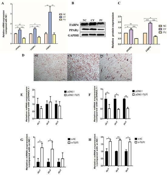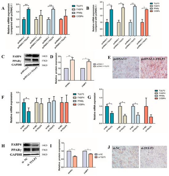 TULP3 overexpression vector was transfected into precursor adipocytes and induced differentiation, the cells were collected at D0 and D8, and the mRNA expression levels of PPARγ, FABP4, and C/EBPα were detected. Cells were harvested and a cell scraper used on D8, and PPARγ and FABP4 protein expression levels were detected using Western Blot and stained with Oil Red O. At D0, the expression of PPARγ in the pcDNA3.1-TULP3 group was significantly higher than that of the control group (p < 0.05) (Figure 3A). At D8, the expression of PPARγ, FABP4 and C/EBPα in the pcDNA3.1-TULP3 group was significantly higher than that of the control group (p < 0.05) (Figure 3B). Western Blot results and fluorescence quantification results were consistent (Figure 3C,D). For D8-cells stained with Oil Red O, the number of lipid droplets in the pcDNA3.1-TULP3 group was significantly more than that in the control group (Figure 3E). Thus, overexpression of TULP3 could promote the differentiation of precursor adipocytes.