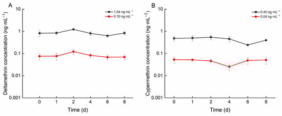Concentration of deltamethrin and cypermethrin in water of different concentration groups: (A): deltamethrin; (B): cypermethrin.
