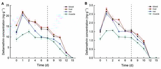 Concentration changes in C. auratus tissues under different concentrations of deltamethrin: (A) 1.04 ng·g−1; (B) 0.10 ng·g−1. The dotted line is the time when fish were move to water without pesticides.