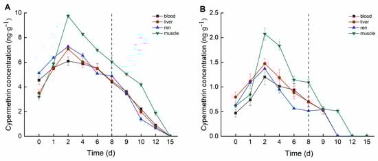 Concentration changes in C. auratus tissues under different concentrations of cypermethrin: (A): 0.40 ng·g−1; (B): 0.04 ng·g−1. The dotted line is the time when fish were move to water without pesticides.