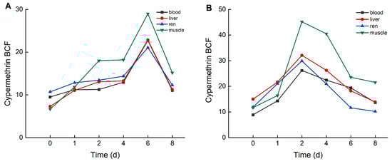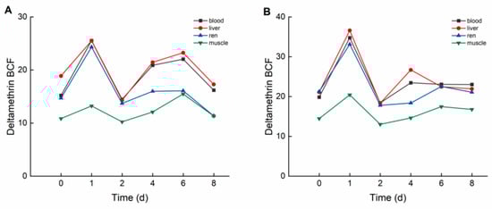 BCF of C. auratus tissues at different concentrations of deltamethrin: (A): 1.04 ng·g−1; (B): 0.10 ng·g−1.