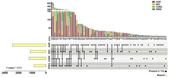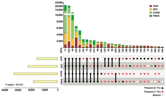 Prokaryotic 16S rRNA genes were obtained through NGS from 28 soil samples. After actinobacterial data filtering of OTUs, a total of 93,236 sequences were retained. The OTUs were distributed in four different land uses and distributed as follows: 18,289 sequences in agricultural soils (19.61%), 23,577 in secondary soils (20.79%), 34,443 in conserved soils (36.93%), and 19,377 in preserved soils (22.67%). A total of 107 OTUs were observed and unevenly distributed across land uses, where agricultural samples presented 85 OTUs (83.33%), 60 secondary OTUs (57.84%), 55 conserved OTUs (53.92%), and 47 preserved (46.07%), with a certain degree of overlap in each land use. OTUs with a relative abundance within each land use type greater than 1% were cataloged, representing almost 90% of the total acquired sequences (Figure 2), although they accounted for only 25.92% (28) of the total observed OTUs. Conversely, 80 OTUs (73.83% of total) comprised only slightly more than 10% of the total sequences (Figure 3). Detailed information about each OTU is provided in Supplementary Table S1.