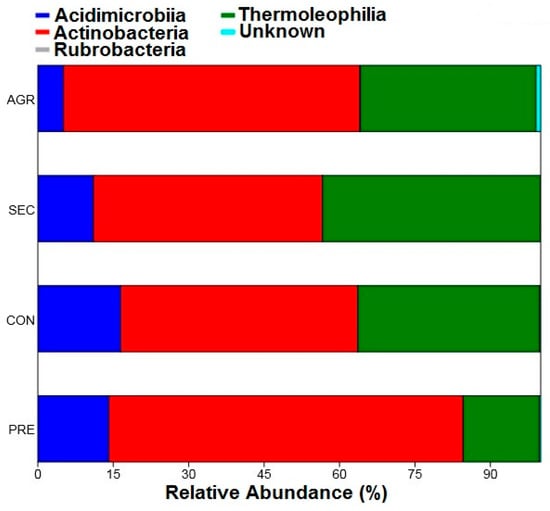 The Actinobacteria class is recognized as dominant in most soils, a fact that was also corroborated in this study, where it represented the highest relative abundance among the classes studied. The Thermoleophilia class comprises strains of the Actinobacteria phylum with thermophilic characteristics that are found abundantly in soil and hot springs [41]. The plots in the secondary area had a higher relative abundance (43%) for strains of this class, which may be related to the low vegetation cover, which results in higher soil temperatures and selecting more adapted communities.