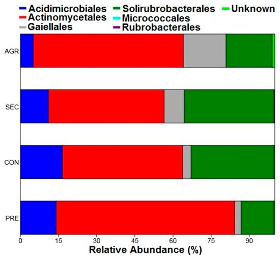 Regarding the relative abundances of the orders, the results followed the same pattern presented by the classes, with prevalence of the order Actinomycetales, followed by Solirubrobacterales (Figure 5). For this taxonomic level, the order Micrococcales stands out, which exhibited a relative abundance of 0.016% of the agricultural area and was present only in one sample plot (A34), indicating that it was a rare taxon.