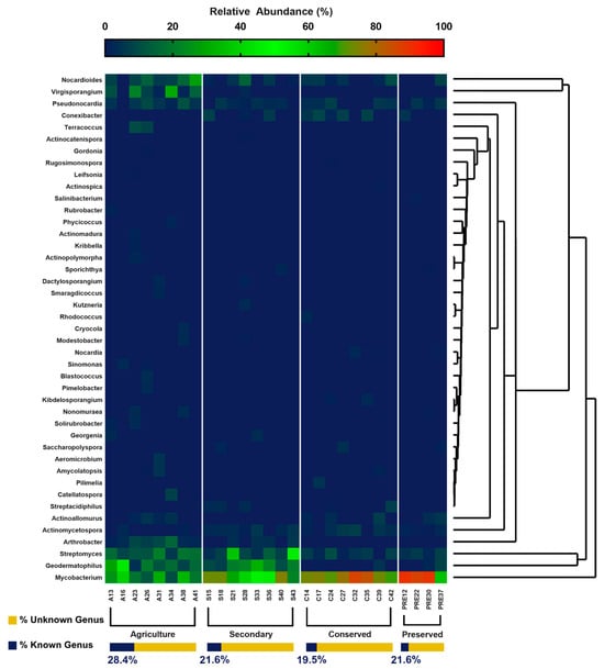 Further investigation at the family and genus levels revealed more details and key differences between land uses. Regarding the known Actinomycetota families, 27 families were identified (Figure 6), of which 25 were present in the agricultural area, 21 in the secondary area, 18 in the preserved area, and 17 in the conserved area. The most abundant families were Conexibacteraceae, obtaining a maximum value of 32% in the secondary area. The families Mycobacteriacae and Gaiellaceae were also abundant, with maximum values corresponding to 18.34% (preserved area) and 16.59% (agricultural area). Agricultural soil samples revealed a more uneven and random distribution of families. The rarest taxa were those belonging to the families Intrasporangiaceae (0.78%), Actinomycetospora (0.09%), Rubrobacteraceae (0.03%), Actinopolysporaceae (0.02%), Gordoniaceae (0.01%), and Beutenbergiaceae (0.01%). It is also important to highlight the percentage of unidentified taxa, mainly in the soils of the forested areas, which was 58% in the preserved area and 48% in the conserved area (Figure 6), which demonstrates the potential of these areas for the discovery of new species.