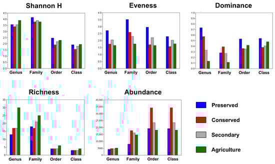 Shannon indices and evenness, dominance, richness, and abundance of bacterial communities across land uses at different taxonomic levels. PRE—preserved; CON—conserved; SEC—secondary; and AGR—agriculture.
