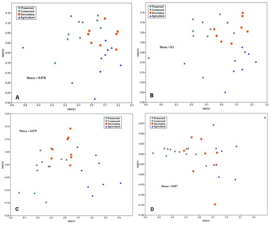 For all analyses, Stress, which was the measure used to verify the adequacy of the model, was below 0.2, indicating good adequacy. For the class taxonomic level, the points sampled in the forested areas had greater data heterogeneity (Figure 9A). On the other hand, the points in the agricultural area were more grouped, suggesting greater similarity between the communities in this area.
