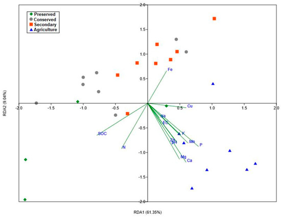 For this analysis, only the data related to bacterial families met the test assumptions. The redundancy analysis confirmed the significant influence of environmental variables on the structure of the bacterial community, and the estimated model was able to explain up to 73% of the variance in abundances. It can be noted that the environmental variables with the greatest influence were soil macronutrients (N, P, Mg, and Ca) and total organic carbon. The sodium content had less influence (Figure 10). The model also indicated that the plots in the agricultural area were more isolated from the others, indicating a more specific community pattern for this land use. The plots sampled within the Park displayed higher variability among themselves, further supporting the findings from the earlier analysis.