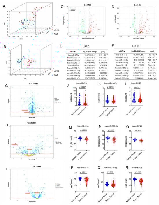 In a previous study, we validated seven miRNAs (hsa-miR-26a-5p, hsa-miR-126-5p, hsa-miR-139-5p, hsa-miR-152-3p, hsa-miR-451a, hsa-miR-200c-3p, and hsa-miR-3135b) and nine miRNAs (hsa-miR-26a-5p, hsa-miR-126-5p, hsa-miR-139-5p, hsa-miR-151a-3p, hsa-miR-151a-5p, hsa-miR-151b, hsa-miR-152-3p, hsa-miR-550a-3p, and hsa-miR-3135b) as potential biomarkers for LUAD and LUSC from a panel of 486 cancer-related miRNAs []. To validate the relevance of these circulating miRNAs in tissues, we obtained miRNA sequencing data for 10 miRNAs (with information for hsa-miR-3135b being unavailable) from 45 LUAD and 44 LUSC tissues, along with matched normal lung samples from TCGA. Principal component analysis (PCA) revealed that LUAD and LUSC tissues clustered differently from paired normal tissues based on the expression levels of six and eight miRNAs, respectively (Figure 1A,B). We compared the expression levels of these miRNAs in 45 pairs of LUAD samples (Figure 1C, Table S1) and 44 pairs of LUSC tissue samples (Figure 1D, Table S2) and found that hsa-miR-451a, hsa-miR-139-5p, and hsa-miR-126-5p displayed the most significant differences in both LUAD and LUSC (Figure 1E,F). Finally, we revalidated the expression levels of hsa-miR-451a, hsa-miR-139-5p, and hsa-miR-126-5p in three miRNA microarray datasets (GSE53882, GSE36681, and GSE15008), and these three miRNAs were significantly decreased in lung cancer tissues compared with normal tissues, except for hsa-miR-139-5p, which was only slightly reduced in the GSE15008 dataset without significance (Figure 1G–R, Tables S3–S5).
