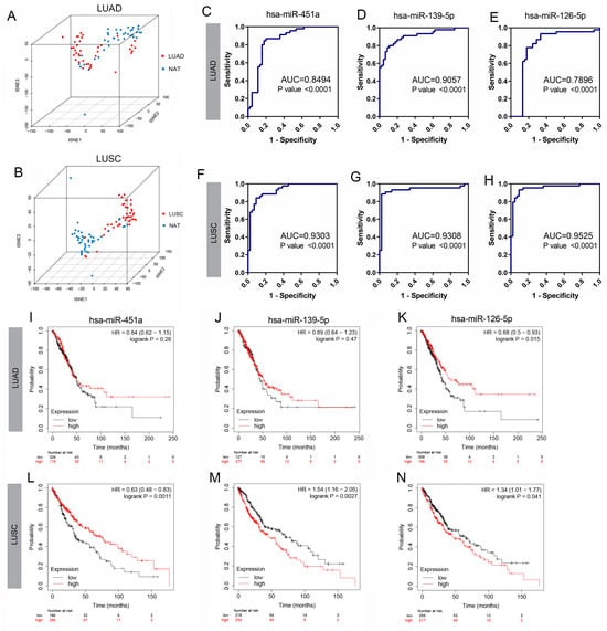 Potential clinical value analysis of three DE-miRNAs in NSCLC. (A) PCA graph showing multidimensional scaling of 45 pairs of LUAD tumors and adjacent normal tissues enrolled in the TCGA dataset based on the expression of 3 miRNAs (hsa-miR-26a-5p, hsa-miR-126-5p, and hsa-miR-451a). (B) PCA graph showing multidimensional scaling of 44 pairs of LUSC tumors and adjacent normal tissues from the TCGA dataset clustered separately based on the expression status of the 3 miRNAs (hsa-miR-26a-5p, hsa-miR-126-5p, and hsa-miR-451a). (C–E) ROC of hsa-miR-451a, hsa-miR-139-5p and hsa-miR-126-5p in LUAD. (F–H) ROC of hsa-miR-451a, hsa-miR-139-5p and hsa-miR-126-5p in LUSC. (I–K) Kaplan–Meier survival curves of hsa-miR-451a, hsa-miR-139-5p and hsa-miR-126-5p in LUAD. (L–N) Kaplan–Meier survival curves of hsa-miR-451a, hsa-miR-139-5p and hsa-miR-126-5p in LUSC.