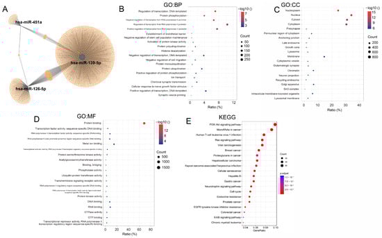GO and KEGG enrichment analyses of potential targets for three DE-miRNAs. (A) The miRNA-target gene network for hsa-miR-451a, hsa-miR-139-5p, and hsa-miR-126-5p was constructed using the online tool miRWalk. (B–D) Enriched biological processes (BP), cellular components (CC), and molecular functions (MF) of target genes for hsa-miR-451a, hsa-miR-139-5p, and hsa-miR-126-5p in the Gene Ontology analysis. (E) KEGG pathway enrichment analysis of potential target genes for hsa-miR-451a, hsa-miR-139-5p, and hsa-miR-126-5p.
