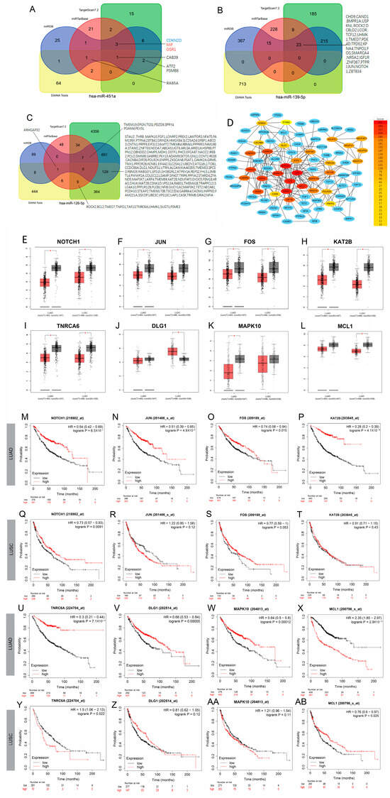 The expression levels, interactions, and potential clinical value of potential target genes of three DE-miRNAs. (A–C) Venn diagram showing common targets of hsa-miR-451a, hsa-miR-139-5p and hsa-miR-126-5p obtained from four miRNA-target prediction websites, DIANA, miRDB, miRTarBase and TargetScan. (D) The PPI network of potential target genes of three DE-miRNAs. (E–L) The expression levels of 8 hub genes in LUAD or LUSC based on the TCGA and GTEx datasets. The asterisk (*) represents a statistically significant difference between tumor and normal tissues, based on the GEPIA platform’s default p-value cutoff of 0.01. (M–AB) The prognostic analysis of 8 hub genes in LUAD or LUSC.