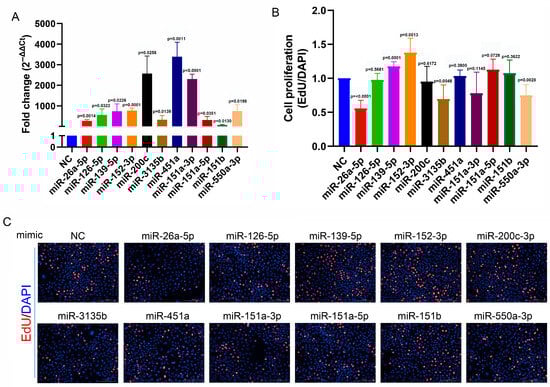We procured miRNA mimics from Suzhou GenePharma Co., Ltd. (Suzhou, China). A549 cells (purchased from The Global Bioresource Center, ATCC, Manassas, VA, USA) were seeded in triplicate in 24- or 48-well plates at an appropriate density and cultured for 24 h. Subsequently, the cells were transfected with miRNA/control mimic (40 nM) using TurboFect™ Transfection Reagent (Thermo Fisher Scientific, Waltham, MA, USA) for a duration of 72 h. Cell proliferation was assessed using the EdU Assay Kit (Ribobio, Guangzhou, China), as per the provided protocol. Images were captured and analyzed utilizing a Lionheart FX Automated Live Cell Imager (BioTek, Winooski, VT, USA), consistent with our previous publication methodology [].
