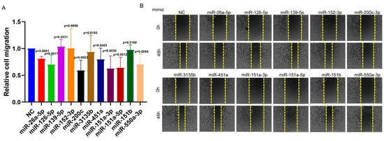 Abnormal proliferation and migration of NSCLC cells are critical factors in tumor progression. To investigate whether these 11 circulating miRNA biomarkers play a role in the molecular events underlying tumor progression, we overexpressed miRNAs by transfecting miRNA mimics into A549 cells (Figure 5A). As illustrated in Figure 5B,C, the overexpression of miR-26a, miR-3135b, and miR-550a-3p reduced the proliferation of A549 cells, while the overexpression of miR-139-5p and miR-152-3p increased cellular proliferation (Figure 5B,C). Moreover, the overexpression of miR-26a-5p, miR-126-5p, miR-200c, miR-451a, miR-151a-3p, miR-151a-5p, and miR-550-3p significantly suppressed the migration of A549 cells (Figure 6A,B).