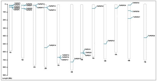 Locations of the 28 TdPDF genes on durum wheat chromosomes. The scale on the left represents the length of the chromosomes. Mb = million base pair.