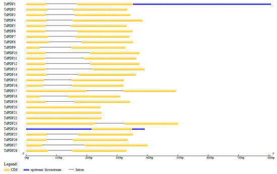 The genomic information of TdPDF genes was used to map gene structure using GSDS2.0. The analysis revealed that 24 out of 28 TdPDF genes consist of two exons separated by an intron, with coding regions located at their 5′ ends (Figure 4). The remaining genes, TdPDF20, TdPDF21, TdPDF22, and TdPDF24, contain only an encoding sequence (exon). Additionally, all TdPDF genes contained the same number of exons as their Triticum aestivum orthologs, except for the orthologous pairs TdPDF21–TaPDF14, which have one and four exons, respectively, and TdPDF15–TaPDF10, which have two and three exons, respectively (Table 3).