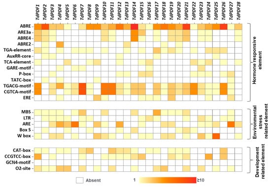 Heatmap of the cis-acting elements in the promoter regions of TdPDF genes.