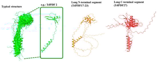 The structural modeling of the full TdPDF proteins revealed that the most common conformation consisted of an α-helix representing the signal peptide, which had a relatively consistent length (around 20–35 amino acids), followed by the defensin domain, which included one α-helix and three antiparallel β-sheets (Figure 6). This conformation was observed in 25 out of 28 models, with only three deviating from this structure.