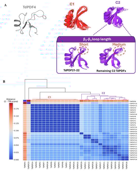 From a structural perspective, cluster C1 exhibited high structural similarity, characterized by a protruding β2-β3 loop due to relatively long β2 and β3 sheets. TdPDF models within cluster C2 were more structurally diverse, with the β2-β3 loop length varying considerably, ranging from short in TdPDF16 and TdPDF17 to medium (Figure 7B).