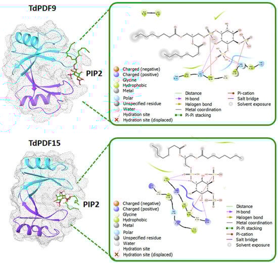 Disulfide bond prediction revealed that all TdPDF structures were stabilized via two to five disulfide bonds, with a median count of four bonds. The docking analysis was performed on TdPDF9 (representative of C1) and TdPDF15 (representative of C2) with PIP2. As shown in Figure 8, the docking results suggested that PIP2 can interact with TdPDF dimers, occupying a binding pocket situated between the two monomers. The interaction between PIP2 and TdPDF is primarily mediated through hydrogen bonds and pi-cation interactions between the phosphate groups and the inositol ring of PIP2 and residues located on the β2-β3 loop of the TdPDF protein.