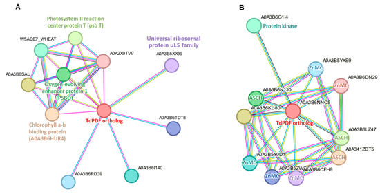 Protein-protein interaction analysis identified interaction networks for 28 TdPDF orthologs in Triticum aestivum. Among these, 27 TdPDFs shared a similar interaction network (Figure 9A). This network included two proteins involved in photosynthesis (photosystem II reaction center protein T and chlorophyll a–b binding protein), a protein essential for stabilizing the manganese cluster (oxygen-evolving enhancer protein 1), a member of the universal ribosomal protein uL5 family, and six uncharacterized proteins. In contrast, only TdPDF27 orthologs exhibited distinct interaction patterns (Figure 9B), engaging with three RNA-binding proteins containing the ASCH domain, five proteins possessing the ZnMc domain (zinc-dependent metalloprotease), and one protein with a kinase domain.