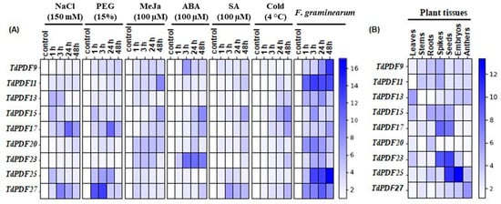 Expression pattern of durum wheat PDF genes. (A) Heatmap showing the expression pattern of TdPDF genes in T. durum plants subjected to 150 mM NaCl, 15% PEG−6000, 100 μM ABA, 100 μM SA, 100 µM MeJa, and F. garminearum for 1, 3, 24, and 48 h. (B) Heatmap of the expression pattern of TdPDF genes in roots, stems, leaves, spikes, seeds, embryos, and anthers. The specific reference CDC gene was used as an internal control for qPCR normalization. The relative expression values were calculated using the 2−ΔΔCt method [47]. Three plants were used per treatment per replicate.