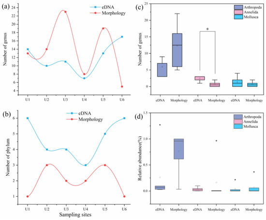Benthic invertebrate richness at each site detected by eDNA metabarcoding and morphological methods at the genus (a) and phylum levels (b) and the number of genus-level taxa (c) and relative abundance (d) of shared phyla detected by both methods; * denote p ≤ 0.05.