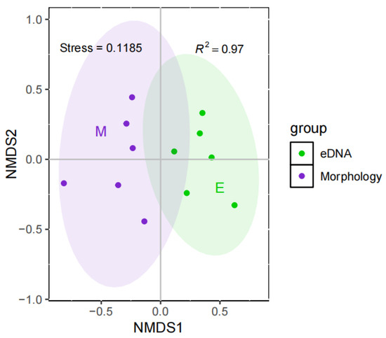 2.6. Comparison of Community Structure Obtained via eDNA Metabarcoding and Traditional Morphological Methods