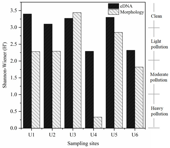 The Shannon diversity index was calculated for each site via both methods. For eDNA metabarcoding, the H’ values of all the sites were above 2. The average value of H’ was 2.95, and the average ecological condition was light pollution. For the traditional morphological method, the average value of H’ was 2.17, the average ecological condition was light pollution, and the lowest value was 0.33 in U4 (Figure 6). The cor.test results showed that the correlation between the Shannon index at each site obtained via the two methods was not significant (p = 0.055). A comparison of the evaluation results of the two methods revealed that the eDNA metabarcoding and morphological methods revealed the same ecological assessment level at only the U3 site. In particular, at the U4 site, the morphological evaluation revealed heavy pollution, whereas the eDNA method revealed light pollution. However, according to the ecological conditions observed at the sampling site, the morphological assessment results were more consistent with the actual ecological conditions of site U4 at the time of sampling. A comprehensive comparison revealed that the average ecological grades of the two methods were consistent. However, when specific sites were compared, except for the U3 site, the ecological assessment results of eDNA metabarcoding were better than those of the traditional morphological method.